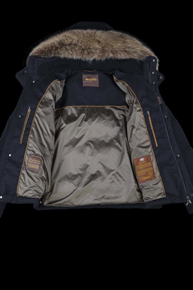 Geacă bomber căptușită cu puf de gâscă, matlasare boudin într-un amestec de lână laminată și corp din microfibră. gluga detasabila cu garnitura din blana de marmota care infrumuseteaza haina. inchidere frontala cu fermoar cu glisare dubla si nasture rezistente la vant cu nasturi snap. buzunare laterale cu fermoar în talie. buzunare interioare pentru obiecte de valoare și manșete tricotate rezistente la vânt.
